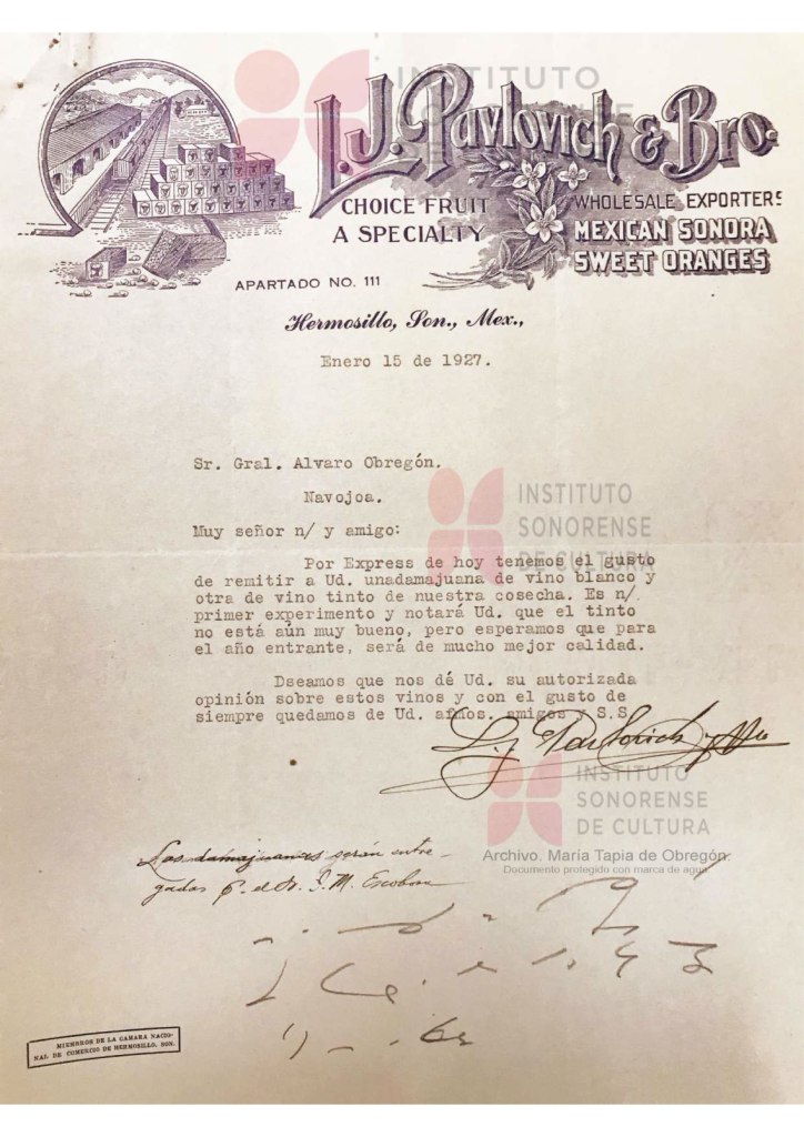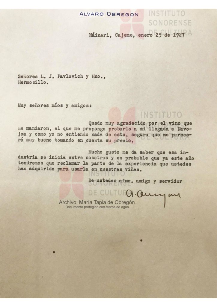 La historia de Sonora se dibuja desde otros ángulos, esta vez el de uno de los primeros productores de vino en forma comercial. Estos documentos que se presentan, atestiguan una grata y curiosa anécdota de una carta y su réplica.